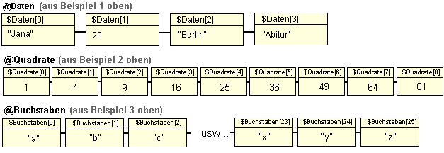 Dabei wird dann automatisch eine Liste namens @Zahlen erzeugt, die zum Zeitpunkt des Erzeugens 6 Elemente hat, nämlich $Zahlen[0] bis $Zahlen[5]. Dabei ist nur $Zahlen[5] mit einem Wert belegt, die anderen Listenelemente sind leer.
